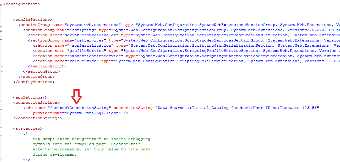 <add name="facebookConnectionString" connectionString="Data Source=.;Initial Catalog=facebook;User ID=sa;Password=123456"